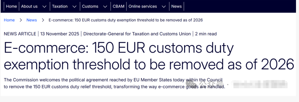 2026年7月1日起,欧盟正式终止“150欧元以下小额包裹关税豁免”政策,这一变革对直发物流形成直接冲击。此前,依赖“低价铺货、小额直邮”的卖家通过邮政小包或专线物流,利用免税政策降低成本,但新政实施后,所有非欧盟直邮的B2C小包均需缴纳关税及清关处理费。以过渡期(2026年7月1日至2028年6月30日)为例,每件包裹需支付3欧元/类固定关税(多品类叠加)及2欧元/件清关费,成本增幅显著。例如,一件价值50欧元的服装包裹,若涉及多个品类,综合税费可能超过10欧元,直接压缩利润空间。